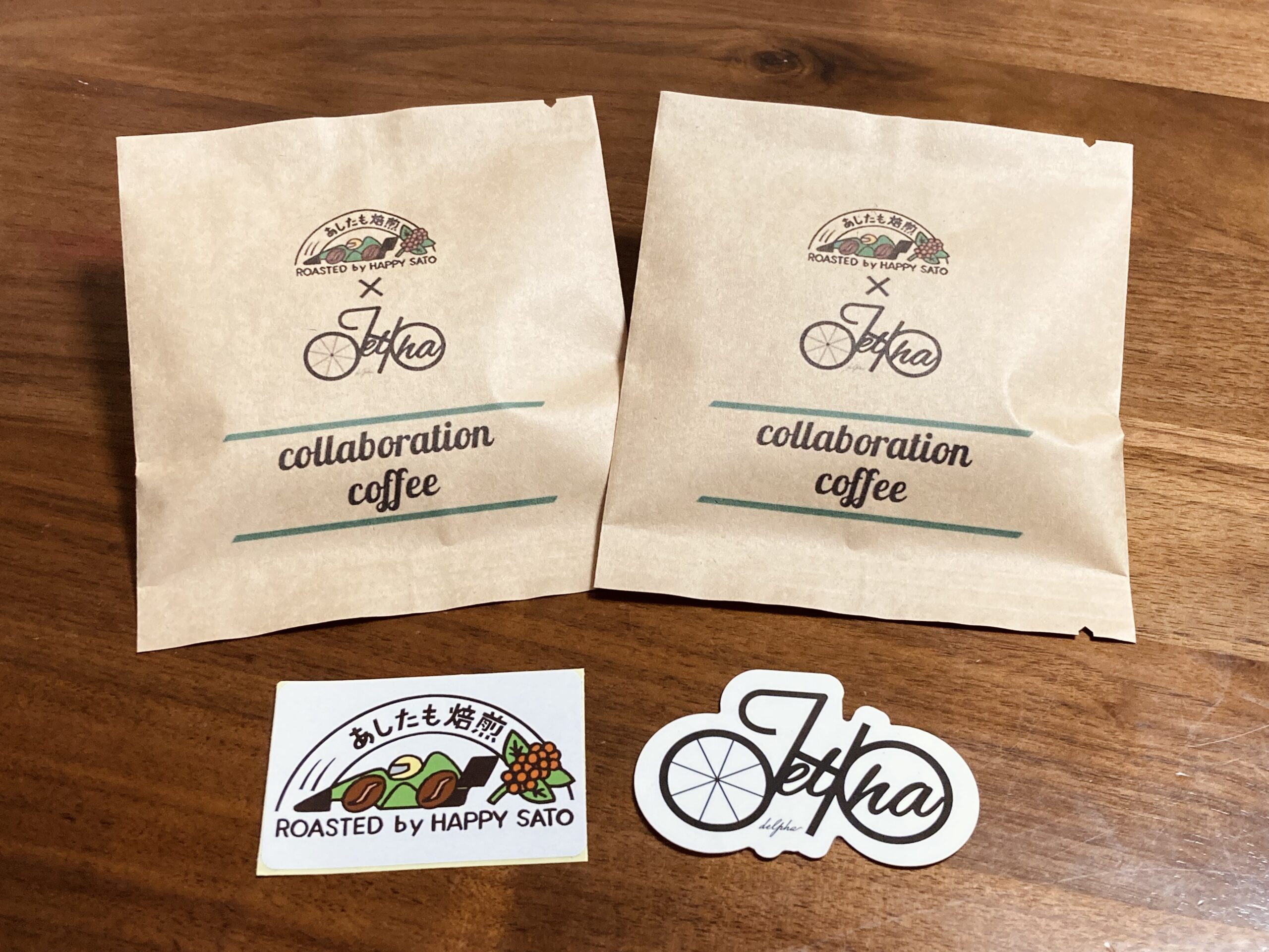 自転車の旅先でも手軽に飲めるドリップバッグコーヒーとTeam Delphaオリジナルステッカー1枚+あしたも焙煎ステッカー1枚のセットです。